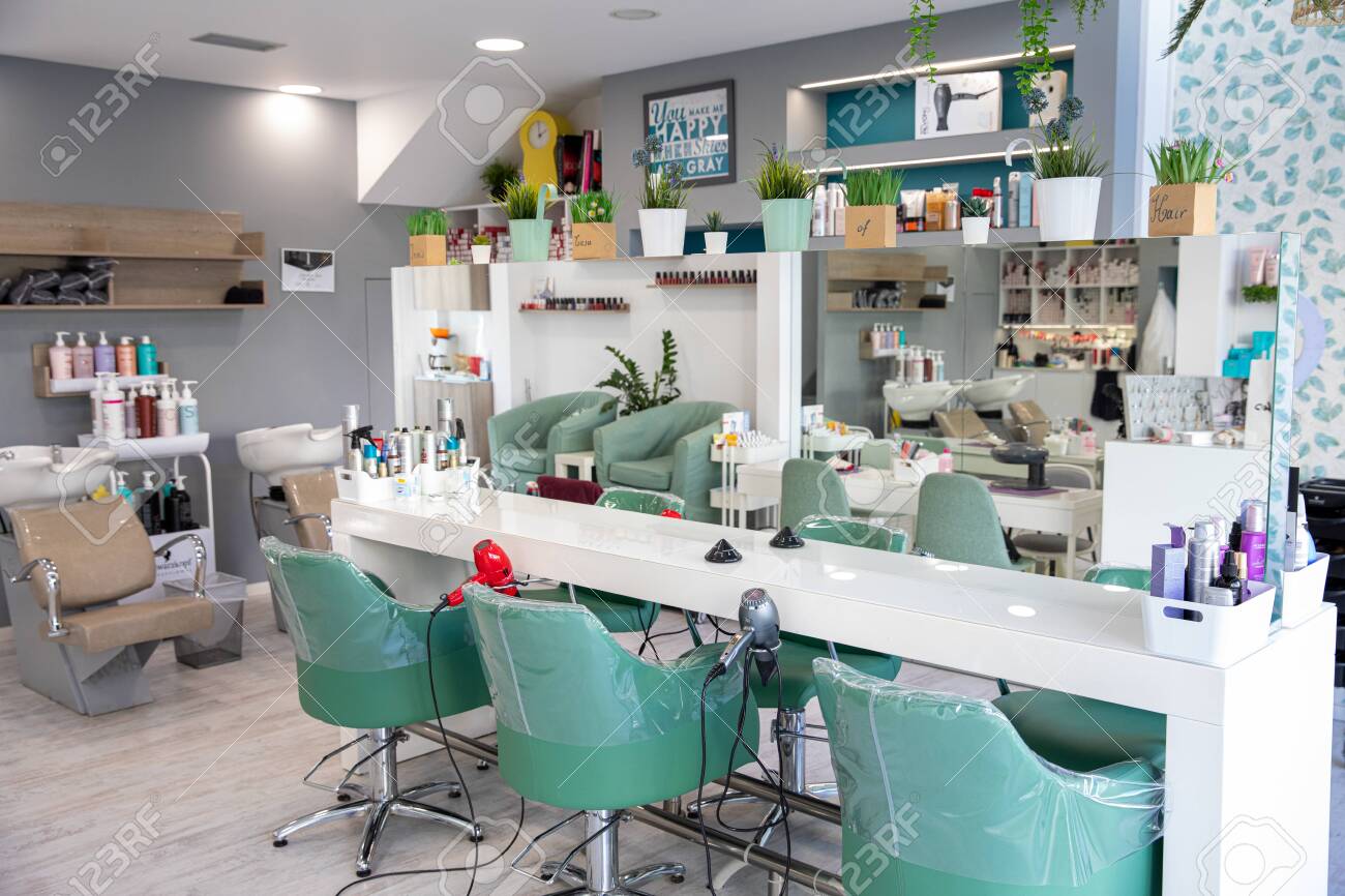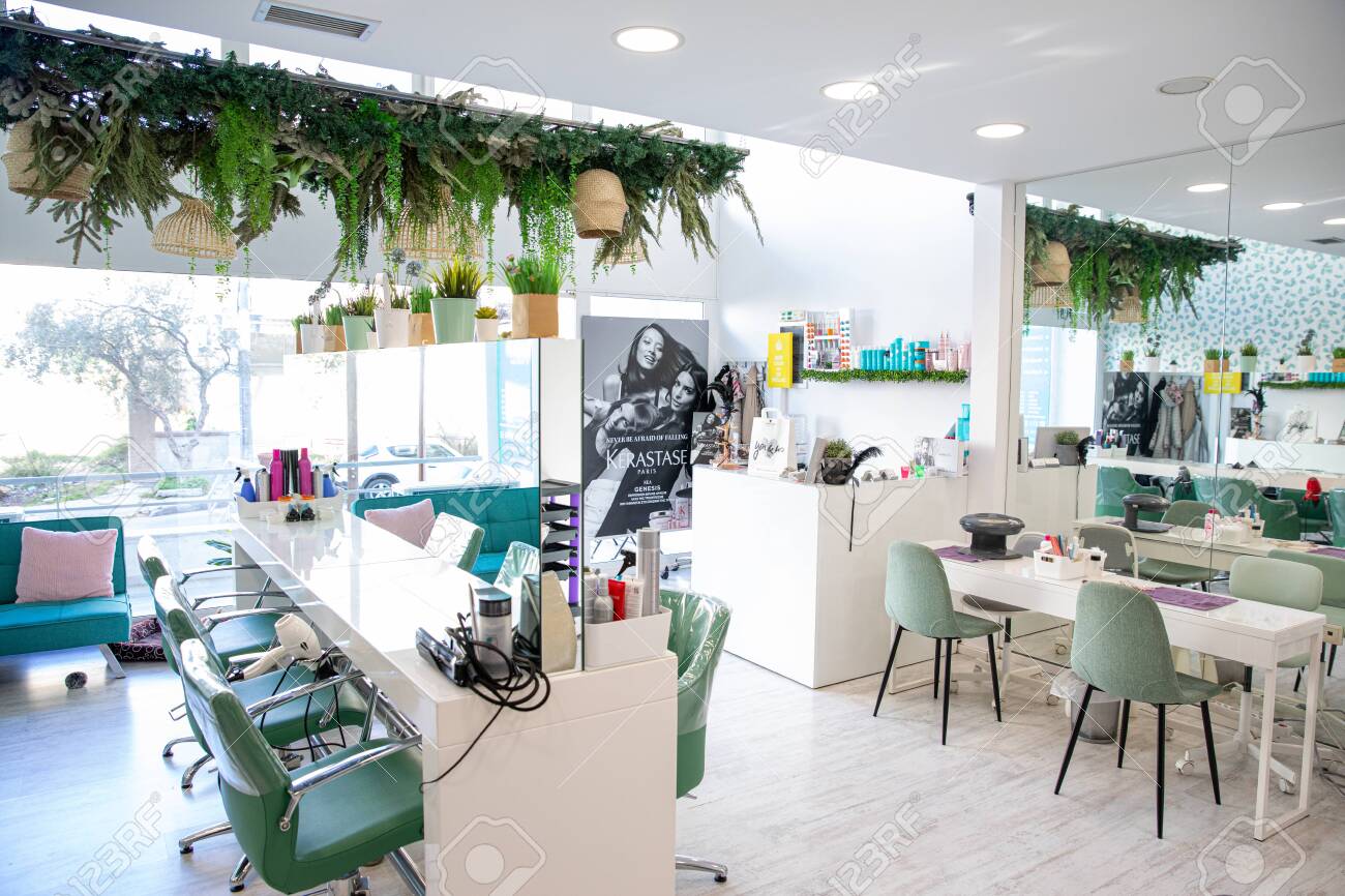 Athens Greece February 18 2020 Modern Beauty Salon Interior Design In White And Aqua Green Colors Horizontal Stock Photo Picture And Royalty Free Image Image 144455452